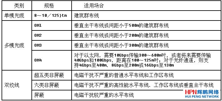 光纜通常應(yīng)用于建筑群子系統(tǒng)和垂直(主干)子系統(tǒng),部分應(yīng)用于對傳輸速率和安全性有較高要求的水平布線子系統(tǒng);雙絞線則通常應(yīng)用于水平布線子系統(tǒng),也可應(yīng)用于投資較少,且對傳輸速率要求不太高的垂直(主干)子系統(tǒng);而同軸電纜很少應(yīng)用于綜合布線系統(tǒng)。線纜類型及其適用場合如表3—3所示。