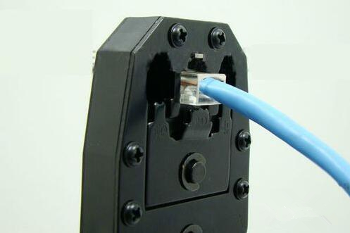 5、把帶網(wǎng)線的水晶頭放入網(wǎng)線鉗的壓線槽內(nèi),緊緊用力握住,以保證金屬針腳能夠和網(wǎng)線良好接觸。
