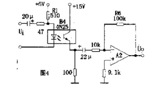 電路如圖4所示.這是一個(gè)典型的交流耦合放大電路.適當(dāng)選取發(fā)光回路限流電阻Rl,使B4的電流傳輸比為一常數(shù),即可保證該電路的線性放大作用。