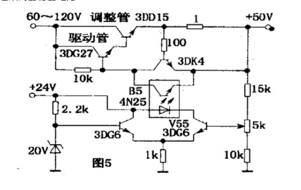 電略如圖5所示.驅(qū)動(dòng)管需采用耐壓較高的晶體管(圖中驅(qū)動(dòng)管為3DG27)。當(dāng)輸出電壓增大時(shí),V55的偏壓增加,B5中發(fā)光二極管的正向電流增大,使光敏管極間電壓減小,調(diào)整管be結(jié)偏壓降低而內(nèi)阻增大,使輸出電壓降低,而保持輸出電壓的穩(wěn)定。