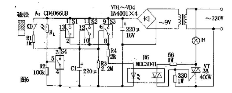 電路如圖6所示。A是四組模擬電子開(kāi)關(guān)(S1~S4):S1,S2,S3并聯(lián)(可增加驅(qū)動(dòng)功率及抗干擾能力)用于延時(shí)電路,當(dāng)其接通電源后經(jīng)R4,B6驅(qū)動(dòng)雙向可控硅VT,VT直接控制門(mén)廳照明燈H;S4與外接光敏電阻Rl等構(gòu)成環(huán)境光線檢測(cè)電路。當(dāng)門(mén)關(guān)閉時(shí),安裝在門(mén)框上的常閉型干簧管KD受到門(mén)上磁鐵作用,其觸點(diǎn)斷開(kāi),S1,S2,S3處于數(shù)據(jù)開(kāi)狀態(tài)。晚間主人回家打開(kāi)門(mén),磁鐵遠(yuǎn)離KD,KD觸點(diǎn)閉合。此時(shí)9V電源整流后經(jīng)R1向C1充電,C1兩端電壓很快上升到9V,整流電壓經(jīng)S1,S2,S3和R4使B6內(nèi)發(fā)光管發(fā)光從而觸發(fā)雙向可控硅導(dǎo)通,VT亦導(dǎo)通,H點(diǎn)亮,實(shí)現(xiàn)自動(dòng)照明控制作用。房門(mén)關(guān)閉后,磁鐵控制KD,觸點(diǎn)斷開(kāi),9V電源停止對(duì)C1充電,電路進(jìn)入延時(shí)狀態(tài)。C1開(kāi)始對(duì)R3放電,經(jīng)一段時(shí)間延遲后,C1兩端電壓逐漸下降到S1,S2,S3的開(kāi)啟電壓(1.5v)以下,S1,S2,S3恢復(fù)斷開(kāi)狀態(tài),導(dǎo)致B6截止,VT亦截止,H熄來(lái),實(shí)現(xiàn)延時(shí)關(guān)燈功能。